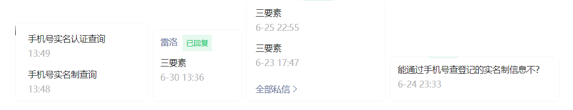 下面是我們近期用戶在后臺(tái)留言:全部咨詢手機(jī)號(hào)實(shí)名制查詢(三要素)、手機(jī)號(hào)實(shí)名認(rèn)證查詢(二要素)。