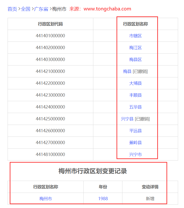 例如:以廣東省梅縣地區(qū)為例(屬于行政區(qū)劃變更特殊案例之一):