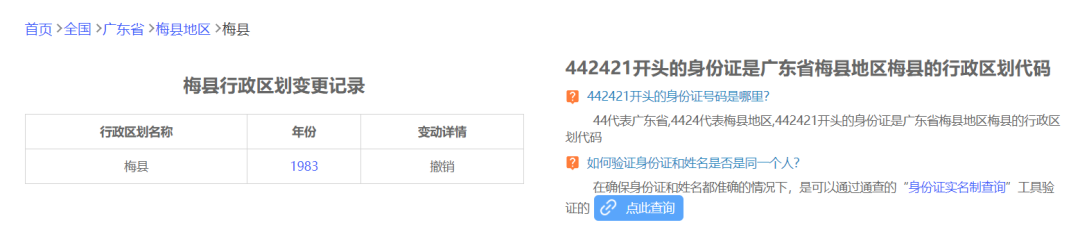 442421開頭的身份證是廣東省梅縣地區(qū)梅縣的行政區(qū)劃代碼(梅縣地區(qū)梅縣1983年撤銷);