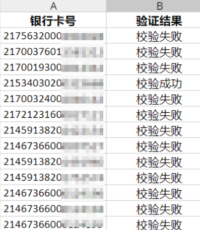 結果顯示,校驗結果(成功或失敗)、銀行名稱、銀行卡類型、銀行卡名稱。