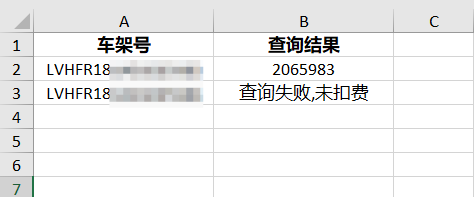 2、上傳文件支持:xlsx,xls格式, 文件內容A列為車架號,數據必須放在第一個工作表,首行為表頭字段。請按要求放置參數,避免因放置位置不對造成查詢不成功。