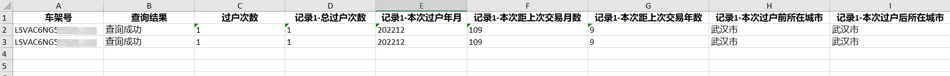 返回結(jié)果:車輛過戶記錄查詢是通過輸入車架號,查詢車輛過戶記錄,返回結(jié)果分為:總過戶次數(shù),本次過戶年月,距離上次交易月數(shù),距離上次交易年數(shù),本次過戶前所在城市,本次過戶后所在城市。