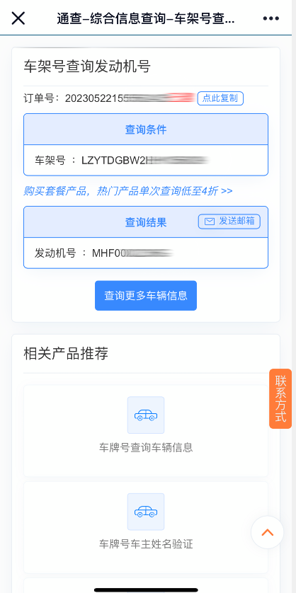 返回結果:車架號查詢發動機號產品功能是通過車架號查詢車輛的發動機號,不涉及車主相關信息,支持全國小型車輛,大型車輛,新能源車型。
