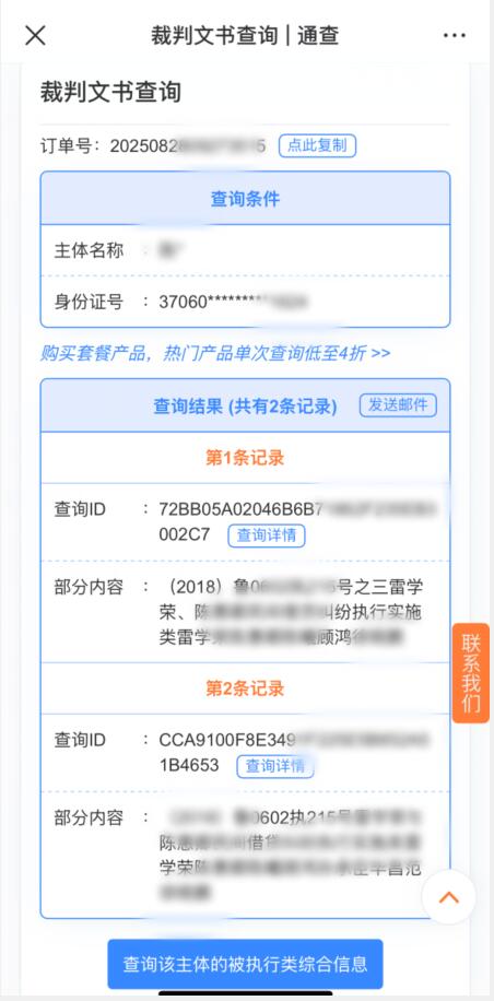 結果顯示記錄條數,每條記錄會顯示查詢ID(通過此ID可進一步查詢文書詳情)、部分內容。
