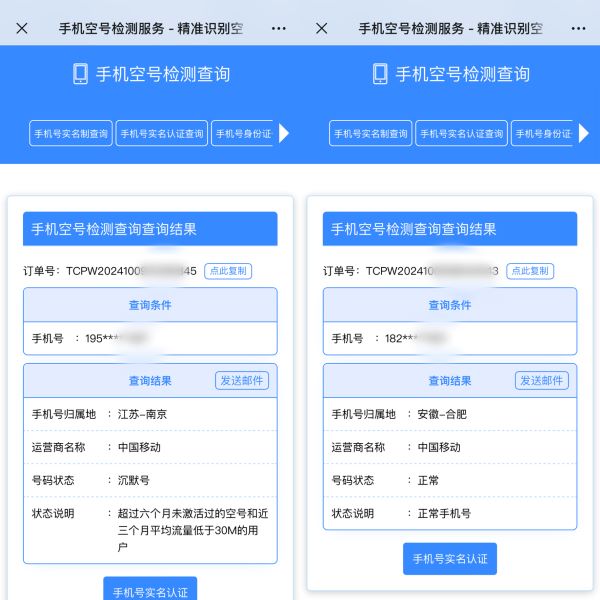 手機空號檢測查詢是指通過輸入手機號碼,查取該號碼的在網活躍度,具體顯示為空號、停機、庫無、沉默號、風險號等。