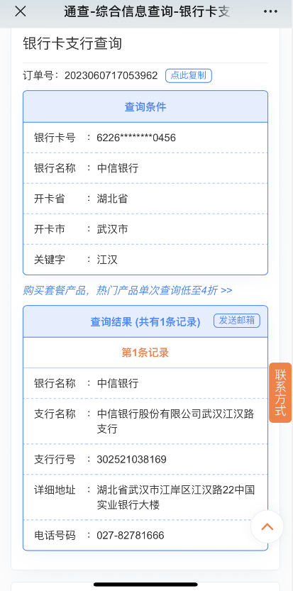 使用多種關(guān)鍵字進(jìn)行查詢,提升查找效率。結(jié)果包括銀行的基本信息,便于用戶了解銀行的服務(wù)信息。查詢結(jié)果是通過關(guān)鍵字來確定的,不是通過銀行卡號,請了解清楚,謹(jǐn)慎選擇,一旦查詢,訂單有結(jié)果無法退款。